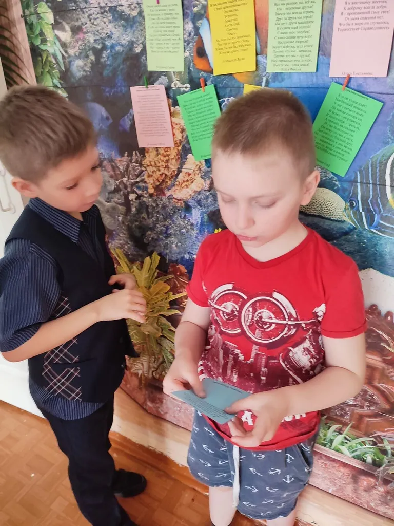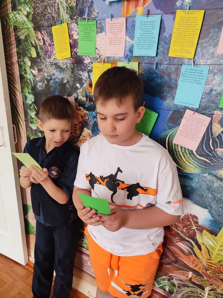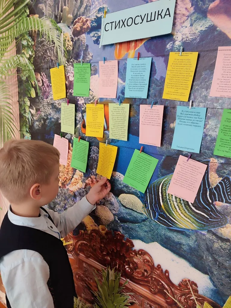 Школьники с любопытством рассматривали яркие листы, выбирали стихотворение, которое особенно отзывалось в их сердцах, снимали его с верёвки и с выражением, старательно читали вслух.