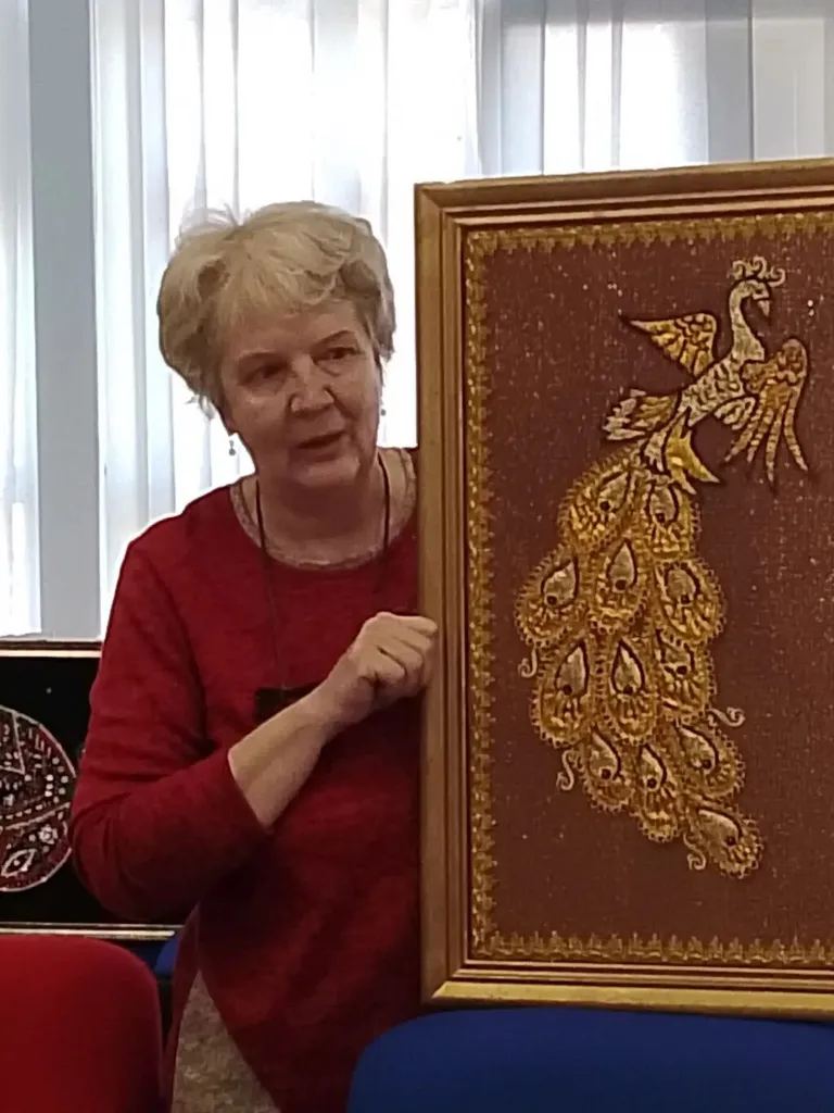 Затем Любовь Павловна Балахнина представила свои оригинальные поделки в стиле декоративного искусства. Картины, вазы, панно – очень привлекательные и оригинальные. Бисер, пайетки, тесьма, зёрна кофе и даже мешковина и шпагат – из любого подручного материала умелые руки Любови Павловны созидают красоту необыкновенную. Сударушки с восхищением любовались чудесными панно: «Жар-птица», «Бабочка» переливалась всеми цветами радуги, «Лебеди» искрились, качаясь на волнах. И много ещё оригинальных предметов, созданных своими руками, продемонстрировала собравшимся Любовь Павловна. Настоящий мастер декоративно-прикладного искусства.